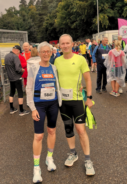 Birgit und Falko Müller nehmen die Möglichkeit der sportlichen Beteiligung natürlich gerne an und unterstützen schon seit Jahren den caritativen Zweck der Veranstaltung. Beide liefen die Stadionrunde. Für jede gelaufene Runde wird in Homburg gespendet. Laufen kann man solange bis auch der letzte Läufer/in von den anderen Laufdisziplinen im Ziel ist. Bei einem neuen Teilnehmerrekord von über 1.000 Teilnehmer/innen kam dann eine sehr große Rundenzahl zu Stande. Für Birgit gab es nach 8 Stadionkilometern die wohl verdiente Medaille, Falko lief noch 3,2km weiter.