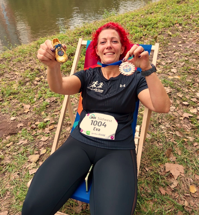 Den emotionalen, verdienten Zieleinlauf bereiteten dann ihr Mann Ben und Mama Ilse. Zudem gab es vom Ultra-Support-Team den goldenen Fun Runner Schuh für den 1. Marathon des Lebens. Hinzu kommt das Alleinstellungsmerkmal für Eva, sie ist die erste Läuferin unseres Vereins, die bei einer Saarlandmeisterschaft an den Start ging. Hier sprang ganz nebenbei der 7. Platz im Gesamteinlauf der SLB-Meisterschaft heraus. Das Treppchen in der Altersklasse wurde leider mit dem 4. Platz ganz knapp verpasst. Der LC Fun Run ist stolz auf seine beiden Marathonläufer, ihr seid für uns heute die Besten!