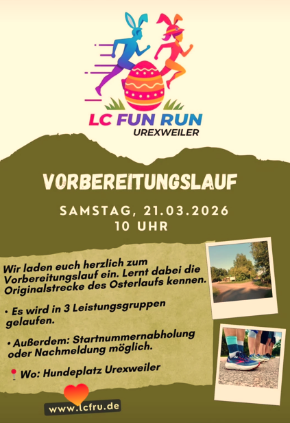 Am Samstag, den 21. März 2026 könnt ihr unsere neue Osterlaufstrecke kennenlernen. Hierzu laden wir alle Interessierten herzlichen ein. Kommt einfach am Samstagmorgen um 10:00 Uhr an den Hundeplatz nach Urexweiler. Wenn ihr bereits für den Osterlauf angemeldet seid, dann könnt ihr an diesem Tag schon eure Startnummer in Empfang nehmen. Sollten noch Startplätze übrig sein, dann könnt ihr euch auch gerne direkt vor Ort anmelden. Wir freuen uns auf eure Teilnahme am Vorbereitungslauf und am Veranstaltungstag selbst.