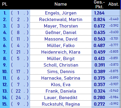 Noch ein Überblick(Top 15 von 26) zum Punkteranking, da es viele Verschiebungen gab: